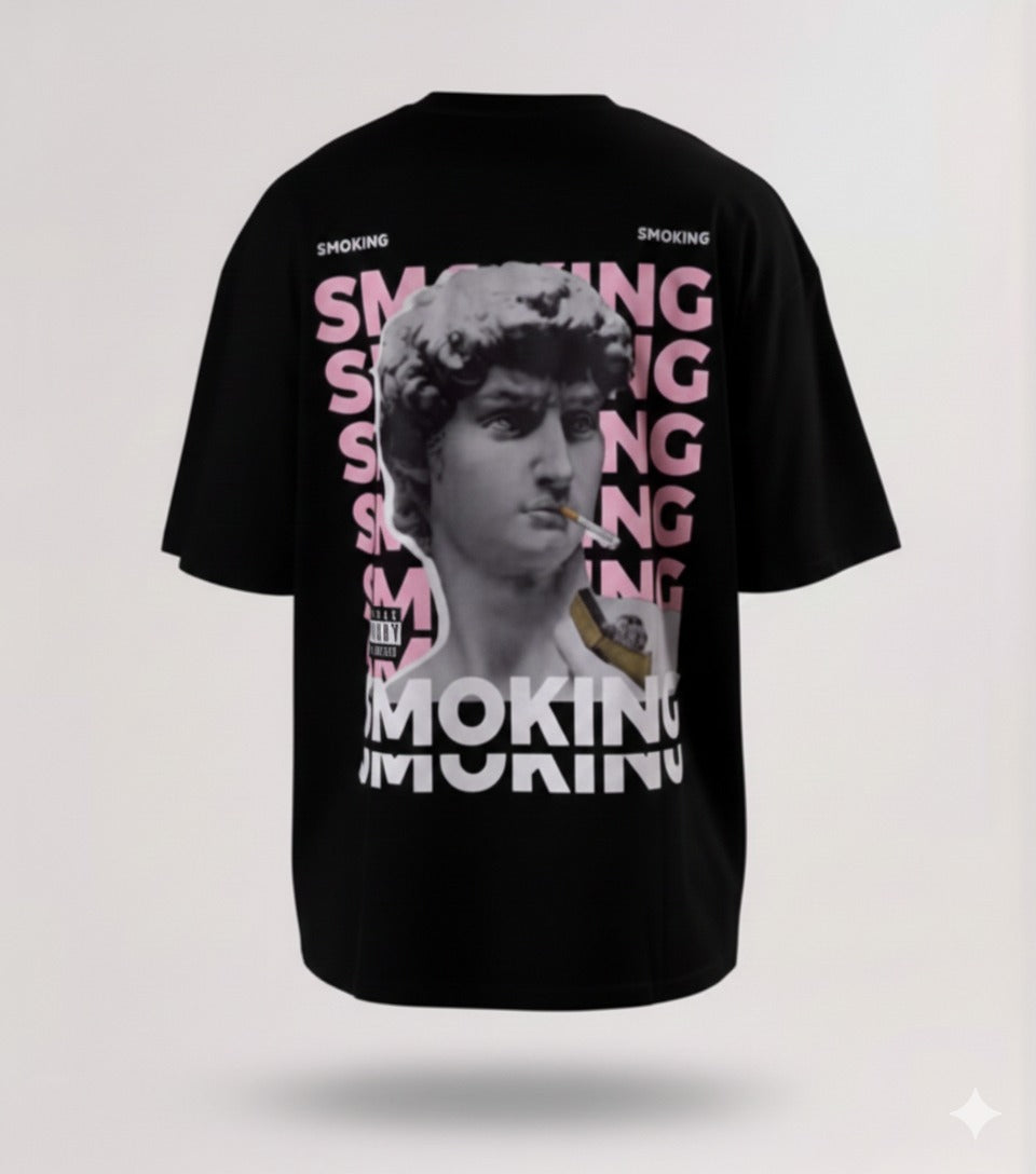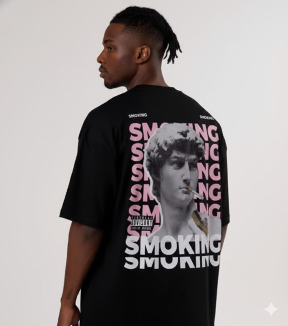 Make a strong streetwear statement with this Men’s Oversized “SMOKING” Back Graphic T-Shirt. Designed with a relaxed oversized fit, this tee features an eye-catching back print that combines repeated “SMOKING” typography with a classical statue graphic, creating a unique blend of modern street style and artistic expression.